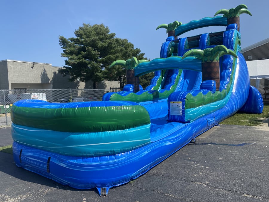 Including a marble green, blue and teal color scheme with palm trees, this water slide is dual-lane and has a large pool at the bottom. It is the perfect ride to show-off for all occasions and is a fantastic blast for kids and adults alike.