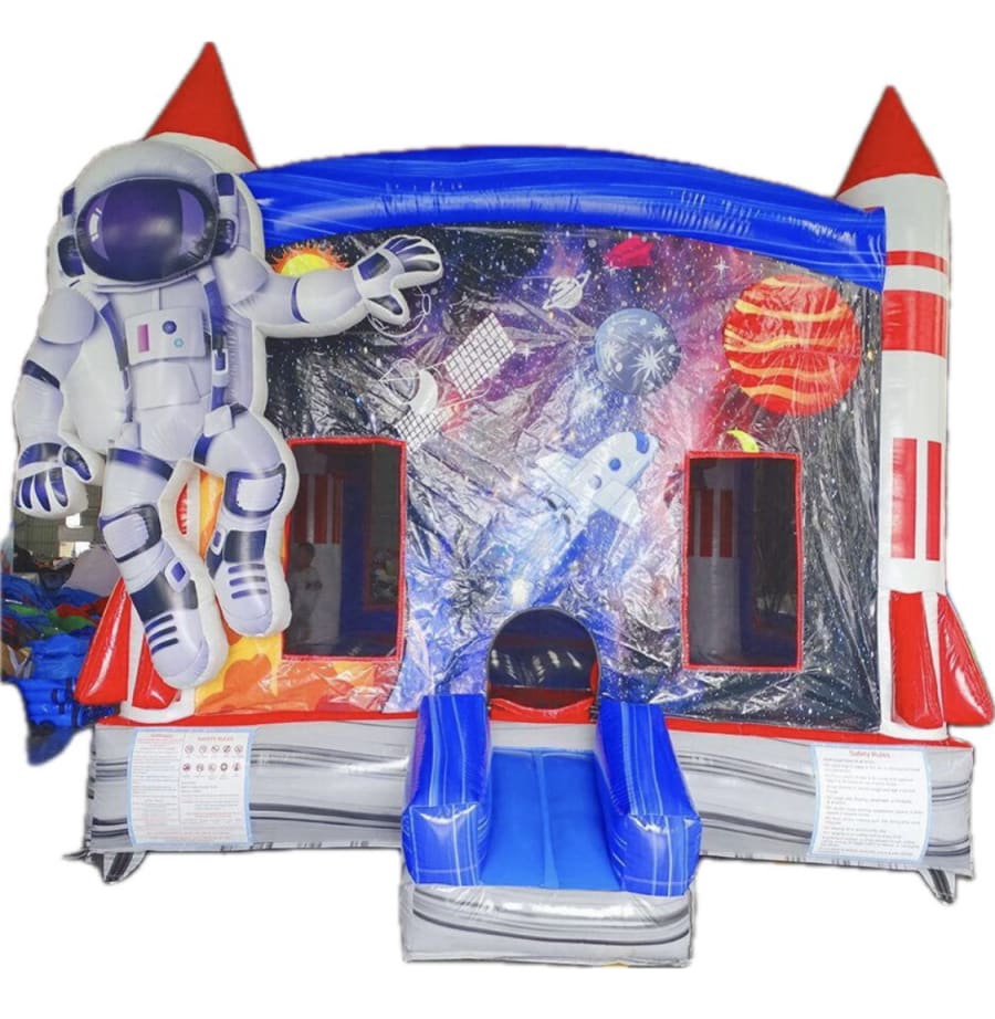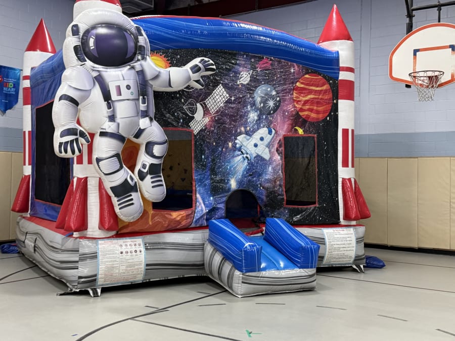 Our Cosmic Bounce House features an inflated astronaut with 3D graphics, two basketball hoops inside, and a large bounce pad. It is the perfect inflatable to emphasize for all occasions