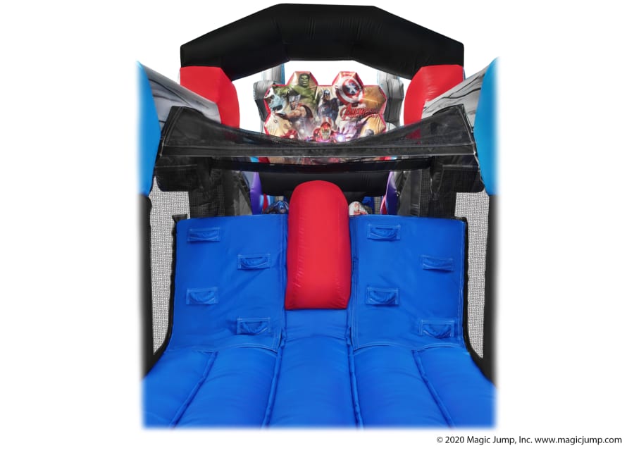 This 50-foot long Avengers-themed Obstacle Course is two (2) pieces and it features a special non-slip material that Magic Jump uses for safe use with water. Piece #1 with entrance features a bounce & obstacle area, with small climber/slide and character obstacle pop-ups of various Marvel Avengers. Piece #2 features tall climber/slide unit with a water misting system that sprays patrons as they slide down into the fun U- shaped splash zone. Exterior includes printable areas with character graphics.