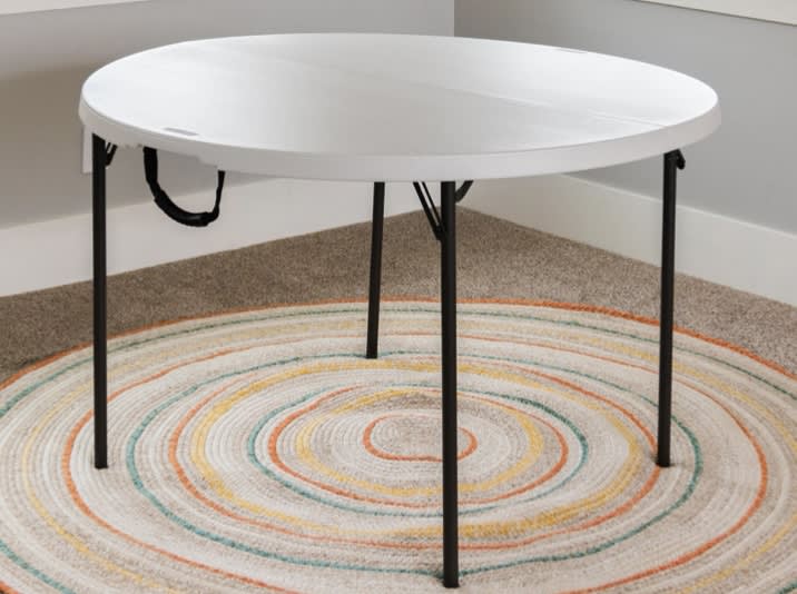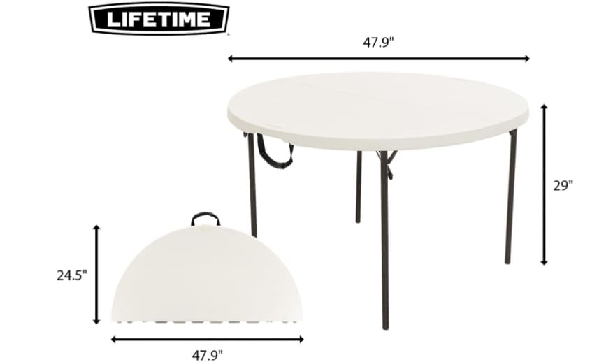 From game nights to birthday parties to craft sessions, the Lifetime 48" Round Light Commercial Fold-in-Half Table is an all-purpose table that's great to keep on hand. It's made from stain-resistant HDPE with an ultra-durable folding steel frame. The table's lightweight design and carry handle make setting it up and taking it down a breeze every time.