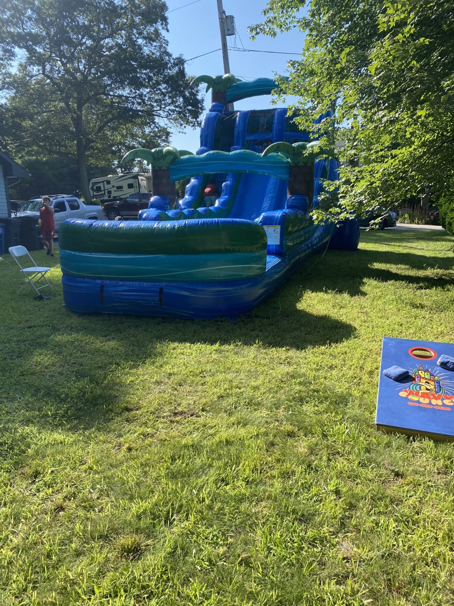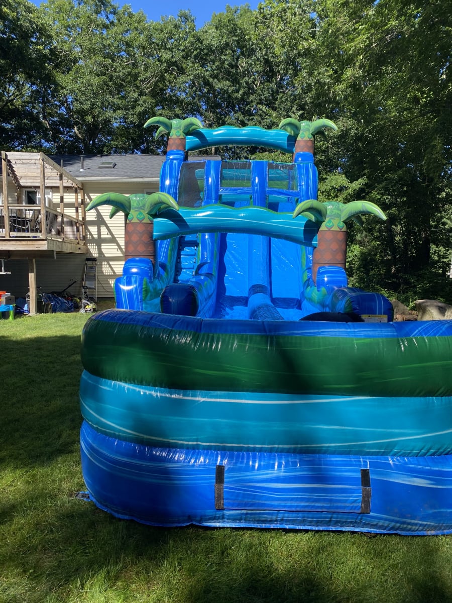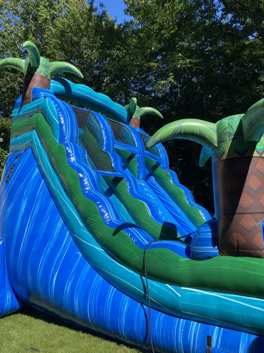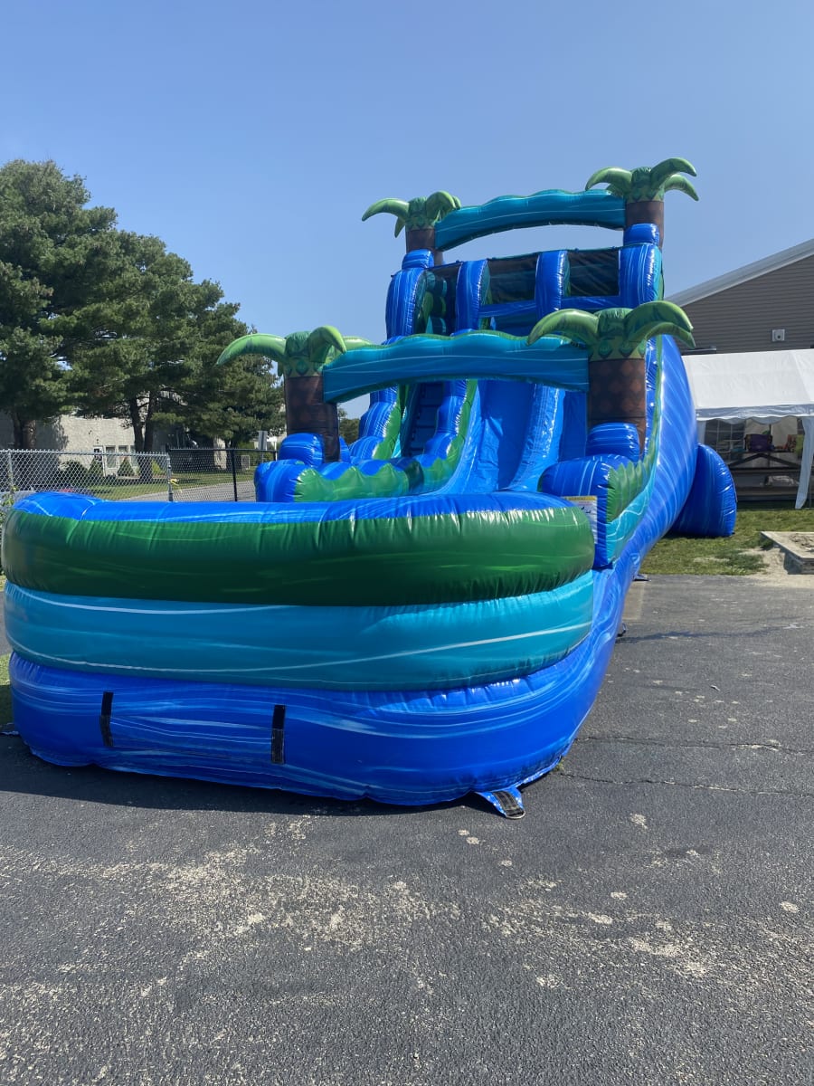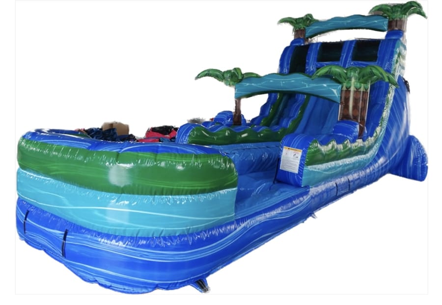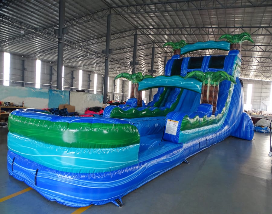 Including a marble green, blue and teal color scheme with palm trees, this water slide is dual-lane and has a large pool at the bottom. It is the perfect ride to show-off for all occasions and is a fantastic blast for kids and adults alike.