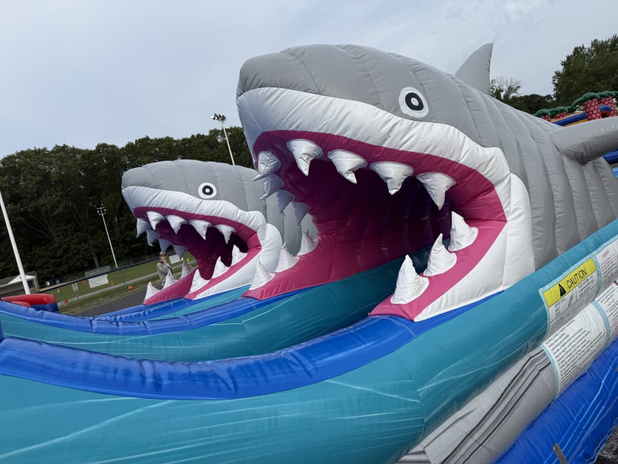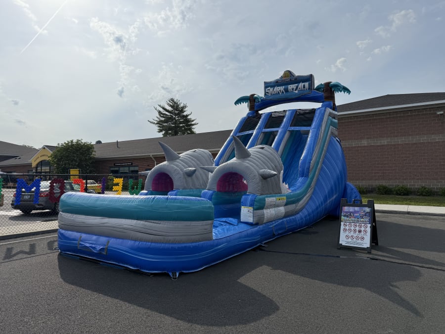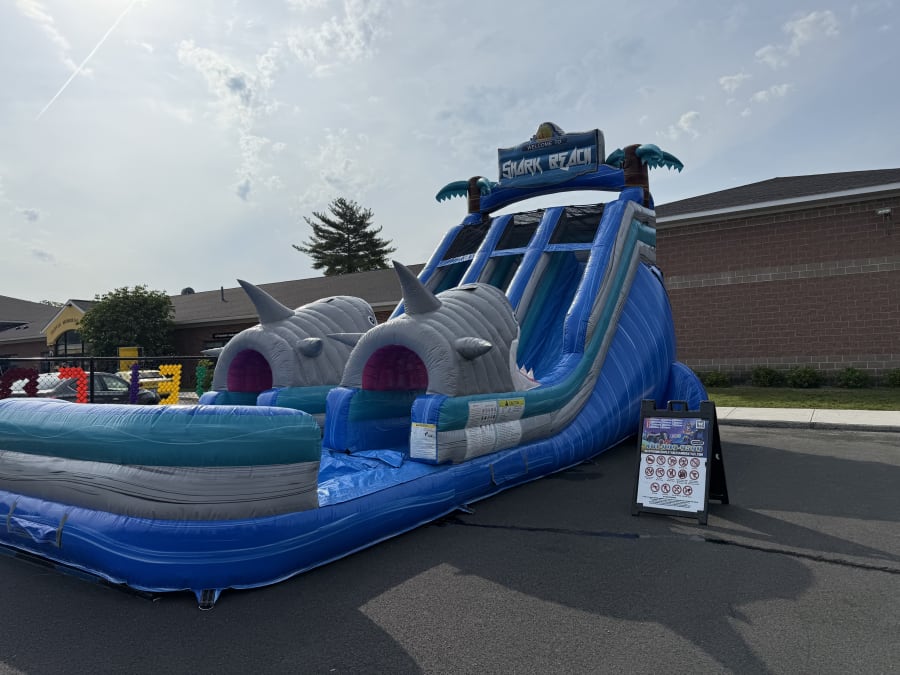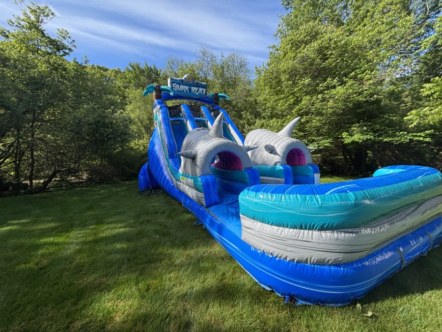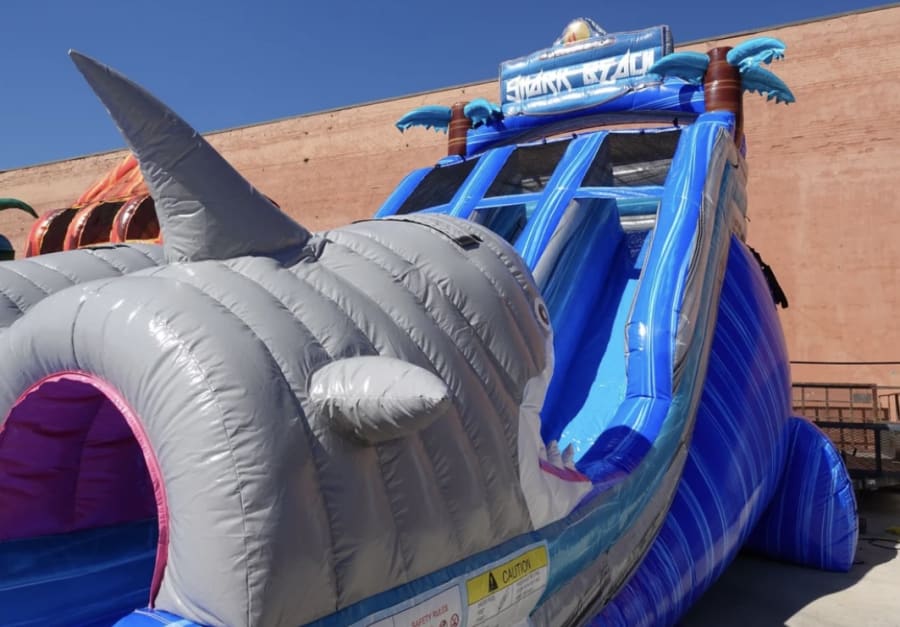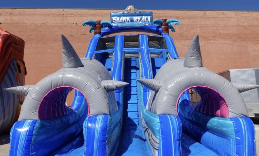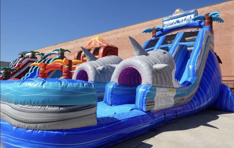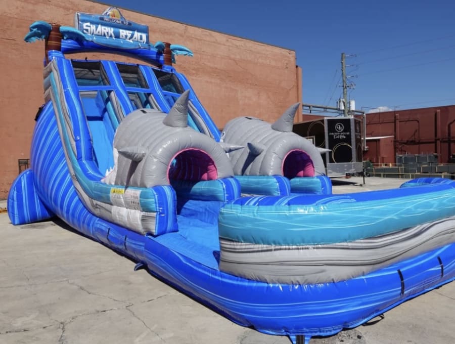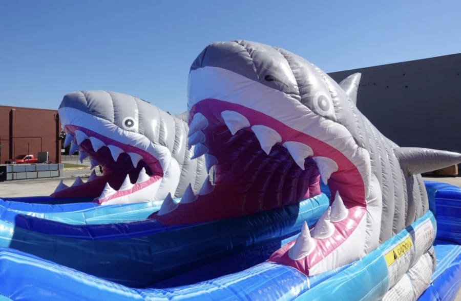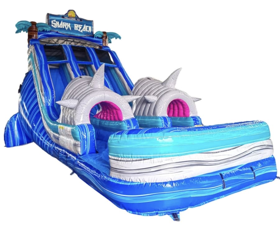 Make waves with our18ft SHARK FRENZY Dual Lane Center Climb Inflatable Water Slide! This in-demand waterslide features: