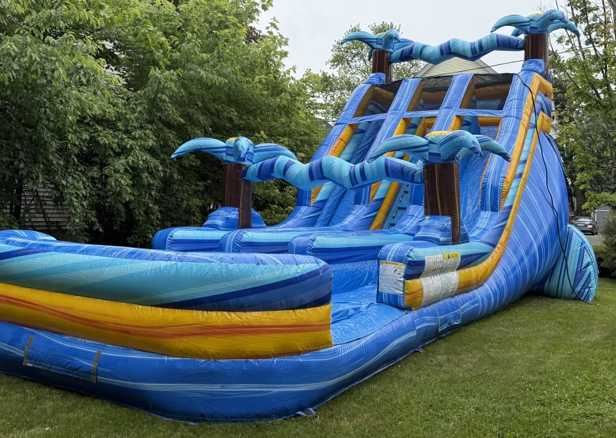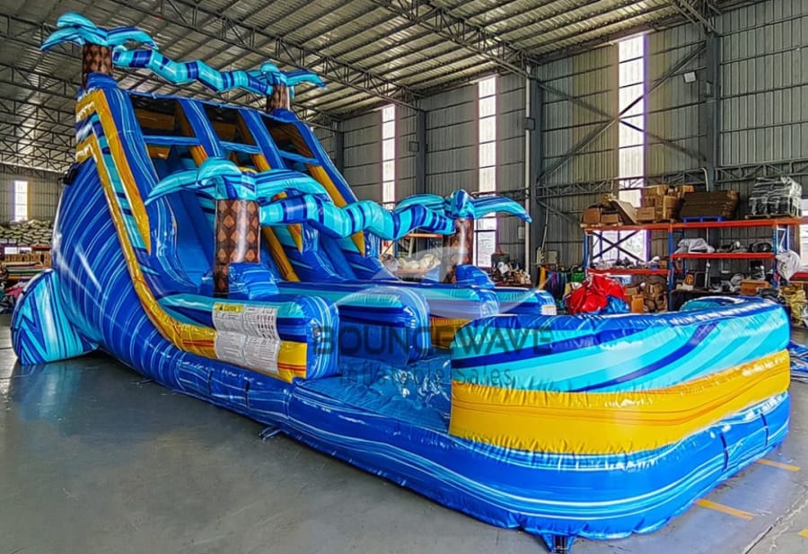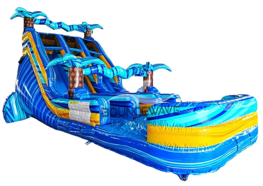 Including a marble green, blue and teal color scheme with palm trees, this water slide is dual-lane and has a large pool at the bottom. It is the perfect ride to show-off for all occasions and is a fantastic blast for kids and adults alike.
